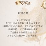 - 改装工事のお知らせー お知らせ ー ぐっすり堂は 2月21日より改装工事に入ります。 3月5日からの新オープンとなりますが 詳細は追ってご連絡いたします。 ご迷惑をおかけいたしますが よろしくお願い申し上げます。 ぐっすり堂